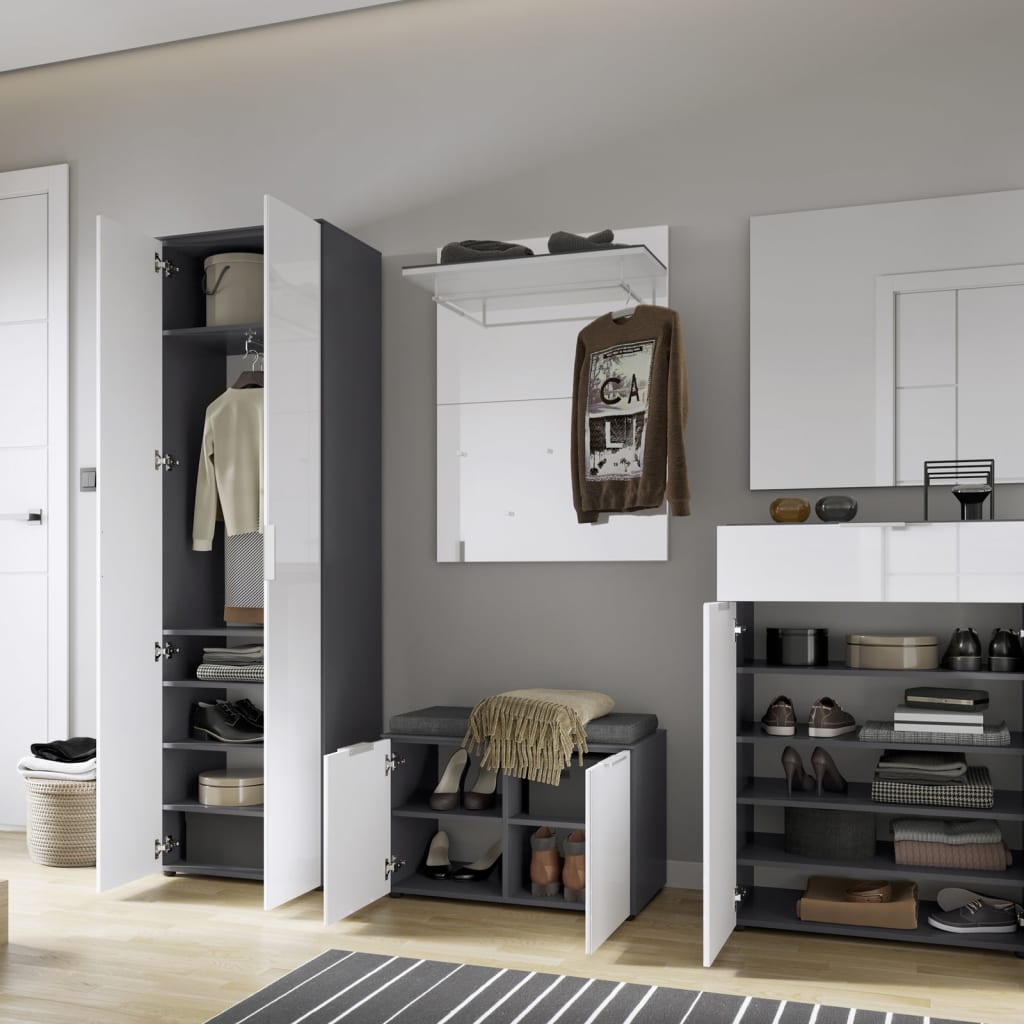 Het contrast tussen de grafischkleurige behuizing en witte glazen fronten maakt deze opbergbank perfect voor je gang. Metalen randgrepen in matzilver maken de uistraling compleet. Bovendien geeft het 8 mm dik bovenpaneel het meubel een minimalistische elegantie. Daarnaast is de schoenenbank voorzien van 2 gedempte deuren. Verborgen achter de deuren zijn een middenzijde en 2 verstelbare planken die plaats bieden aan maximaal 8 paar schoenen. Dit opbergmeubel is 75 cm breed, 48 cm hoog en 40 cm diep.